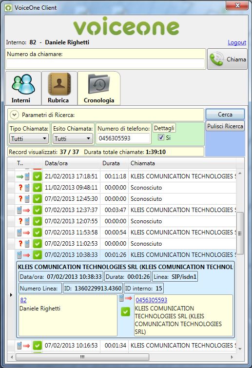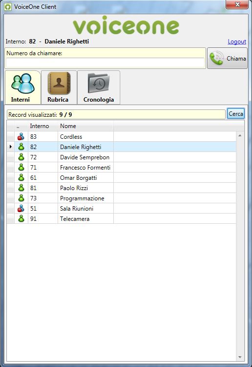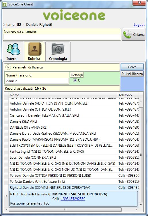 VoiceOne Client è l'applicazione CTI installabile su tutti i sistemi Windows capace di interagire con VoiceOne. Questo client permette il login con le credenziali utente di VoiceOne. Una volta effettuato il login l'utente può visualizzare l'elenco degli interni con il relativo nome e stato, l'elenco delle chiamate fatte e ricevute con statistiche di chiamata e possibilità di ricerca ed esportazione, l'elenco dei contatti presenti nella rubrica del centralino con la possibilità di ricercare sia per nominativo che per numero di telefono. Il client permette di avviare chiamate sui telefoni associati all'utente, indipendentemente dal dispositivo in uso. Inoltre è possibile estendere l'integrazione ad outlook e agli applicativi della Office realizzando funzionalità di click-to-call.