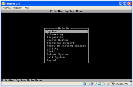L’accesso Console è fornito attraverso la porta seriale presente sul dispositivo oppure attraverso una connessione SSH all’indirizzo IP configurato (default 192.168.1.100:22). Per accedere sono richiesti i dati di autenticazione. Il sistema VoiceOne prevede due utenti: l'utente voiceone e l'utente administrator. La password dell'utente voiceone viene specificata durante la procedura Web di Setup. Questo utente ha accesso ad una shell comandi ristretta attraverso l'uso di un menù a più livelli che guida l'utente nell'esecuzione dei comandi. I parametri di accesso di default per questo utente sono: